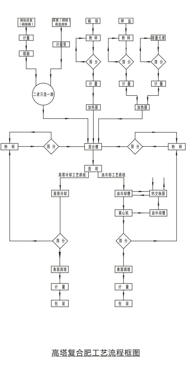 工藝原理固體尿素或硝銨(硝銨磷等)通過熔融器加熱熔融后成為熔融液,也可以直接使用蒸發(fā)濃縮后的液態(tài)尿液(硝銨)液中加入相應(yīng)的磷肥、鉀肥、填料及添加劑制成 混合料漿。混合料漿進入高塔造粒設(shè)備進行噴灑造粒,物料在從高塔下降過程中,與塔底上升氣流阻力相互作用,與其進行熱交換后降落到塔底,落入塔底的物料,經(jīng)篩分表面處理后得到顆粒復合肥。